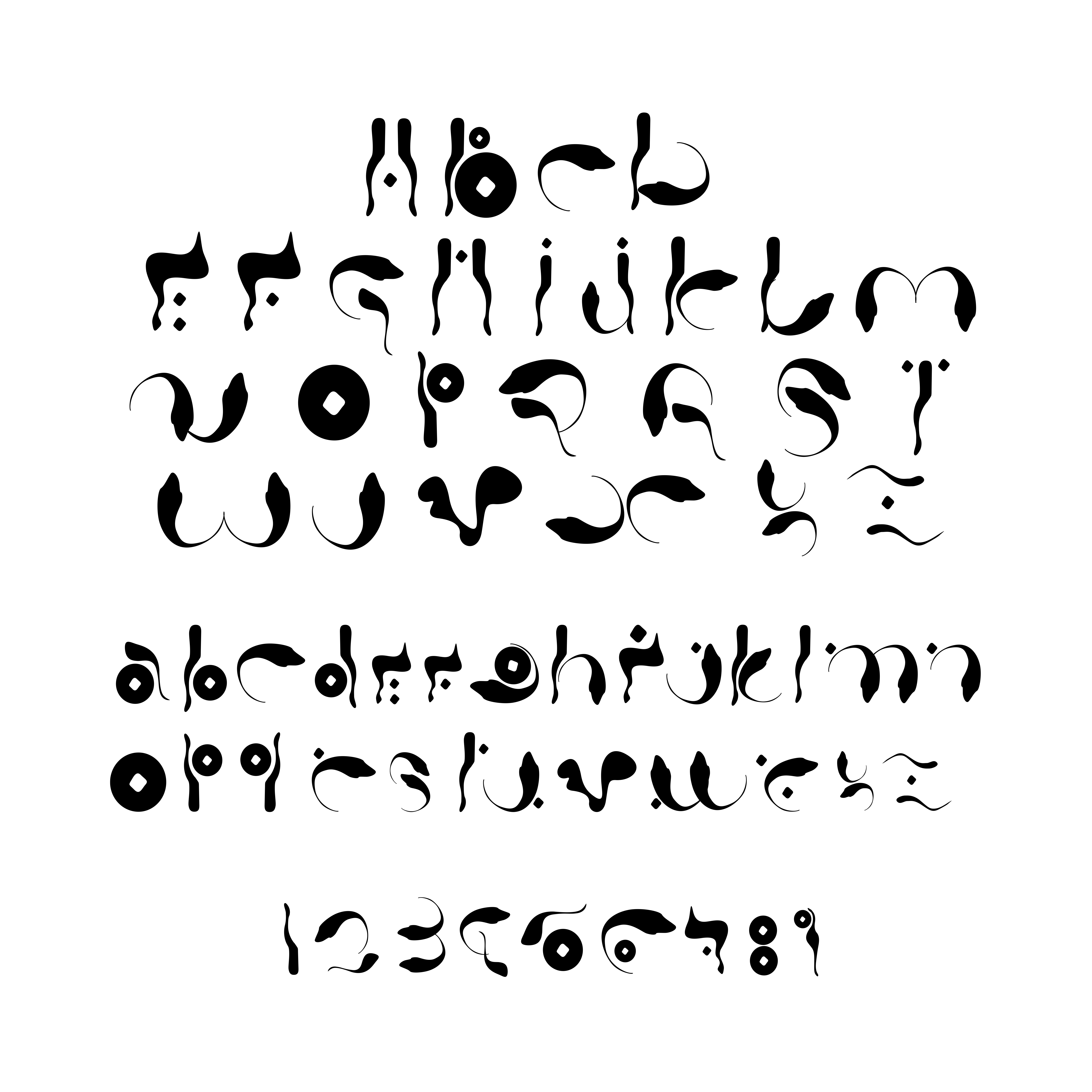 Students were each asked to create a display typeface based on a Wikipedia article chosen at random. In order to get an interesting conceptual distance they first gathered words and images, then explored abstract rhythms by hand.